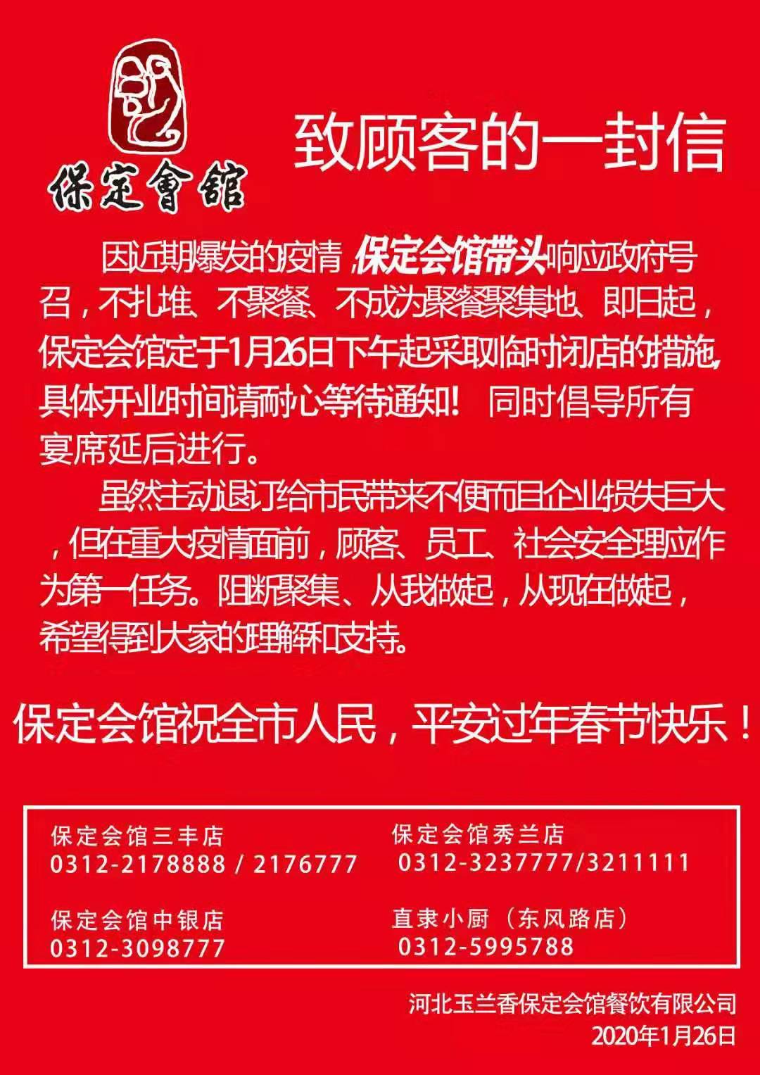 為了配合做好「武漢新型冠狀病毒肺炎」的防控工作,河北省飯店烹飪餐飲行業協會各會員單位帶頭響應不扎堆、不聚餐、不成為聚餐聚集地,主動退訂停業進行休整和消毒防護