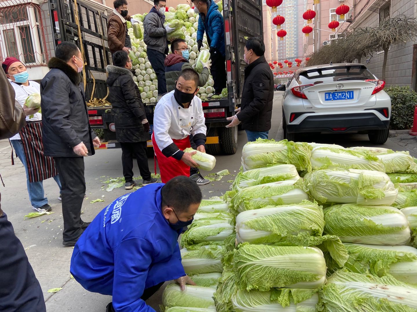 喬家大廚喬海濱董事長將店內為春節期間準備的備用食材在門店進行免費贈送:將幾萬斤大白菜免費發放給周邊的居民和群眾