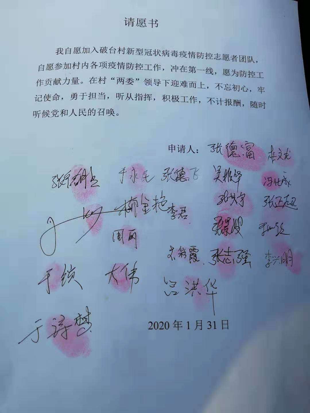 疫情艱險於無形,此時請戰,無異於向艱險「逆行」。儘管如此,全市範圍內越來越多的志願團隊負責人們還是紛紛接到了來自各自隊伍的志願者們自願寫下的「請戰書」,「張德富、杜文龍……呂洪文……孫露平……孟凡傑……於長波、張娜……」,一行行姓名,筆跡堅定;一個個紅色的指印,歃下對人民的志願:「隨時聽候黨的召喚……堅決打贏疫情防控攻堅戰!」