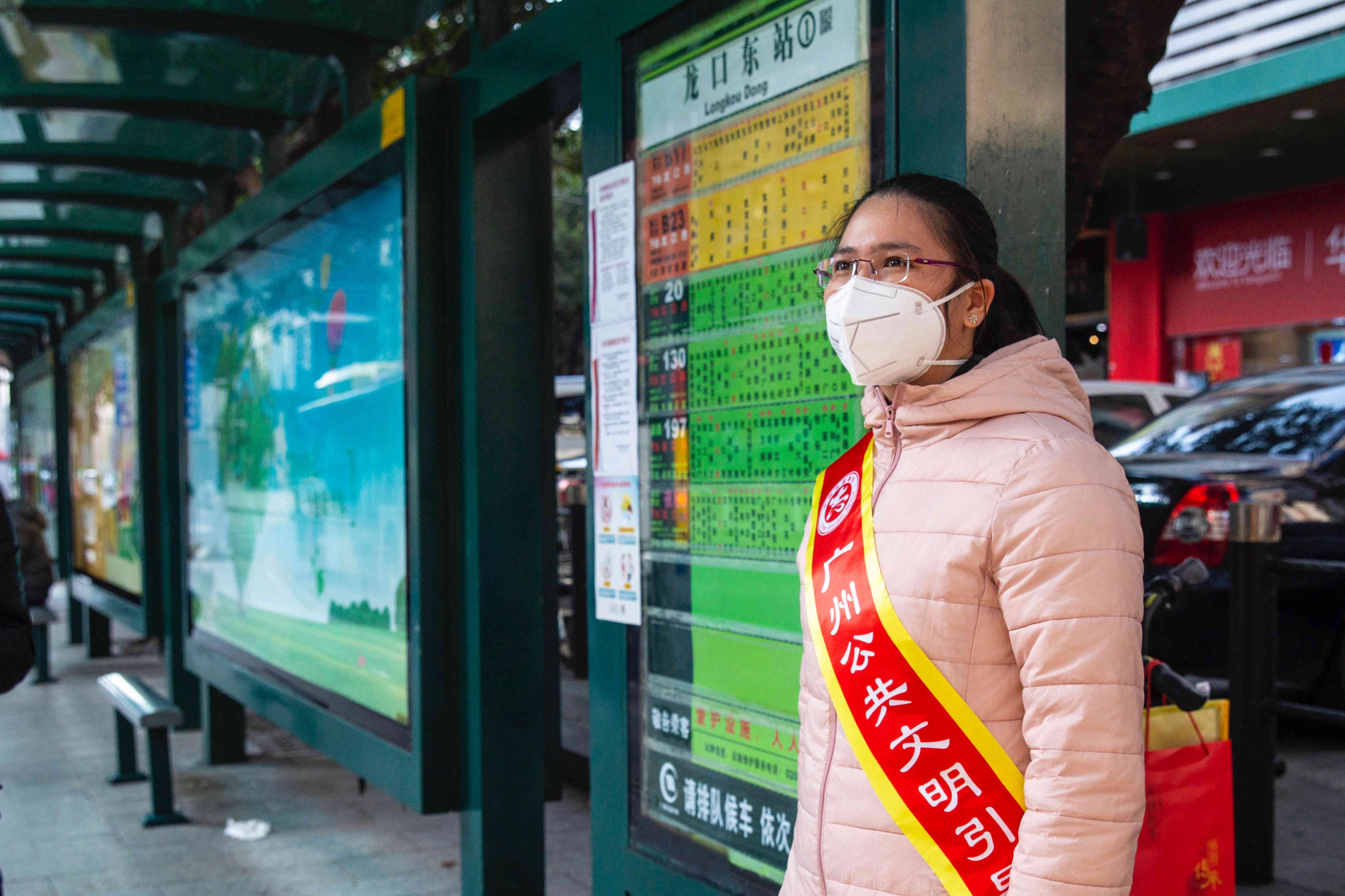記者獲悉,廣州市文明辦已動員全市3300餘名公共文明引導志願者和其他志願組織,下沉到社區和公交站點,累計19410人次參與乘客體溫檢測、就近就醫指引等抗疫應急服務。擔心被感染嗎?「看到市民戴口罩就放心了。」