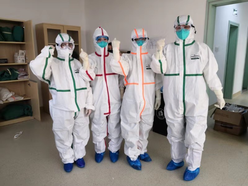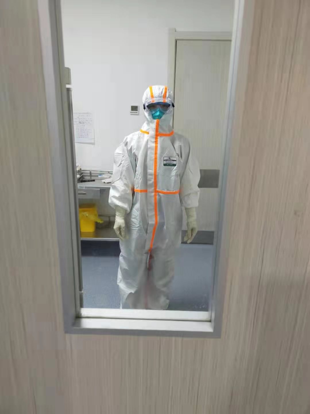 進入了病房後簡單熟悉了環境,馬上投入到了緊張而有序的工作中。之前早已做好思想準備的我們,沒想到還是遇到了困難,平時的常規操作在這裡難度都大大增加了。不論是從專業角度還是從體能、心理角度對我們都是極大的考驗。連帽一體的防護衣是密不透風的,穿戴好後就會出現憋氣。而不停的操作使得呼吸困難、憋悶更為嚴重。而引起的行動不便反而已經是其中較為容易克服的困難了。戴著三層手套要為患者進行配藥,靜脈穿刺,速度比平日裡要慢很多。而患者對我們十分理解,並沒有對我們的工作產生質疑,讓我們十分欣慰。