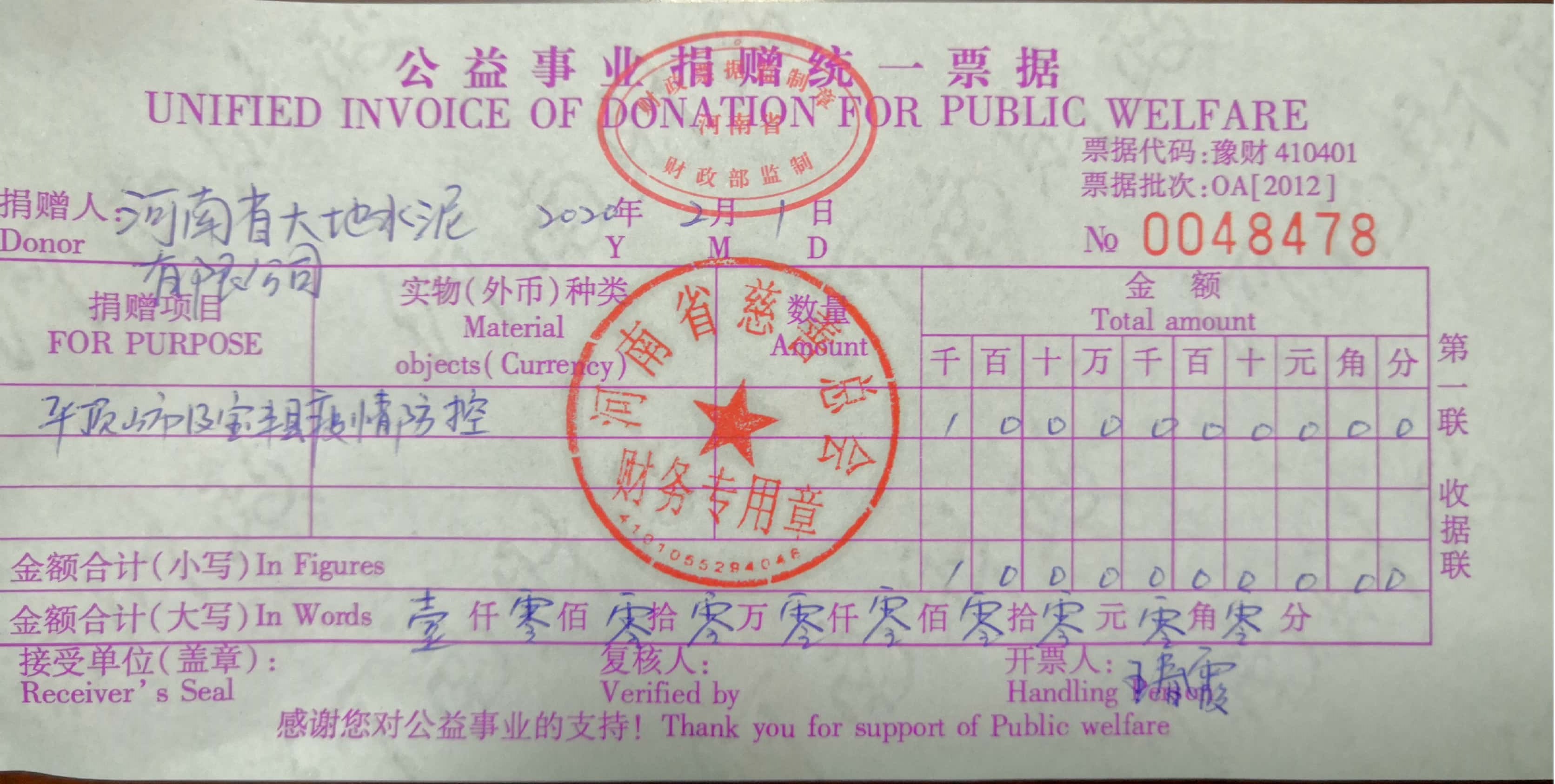 【香港商報網訊】記者 王皓萍 報導:力齊心協力,防控疫情。2月1日,河南省大地水泥集團於向河南省慈善總會定向捐贈1000萬元,用於平頂山市以及寶豐縣的疫情防控工作。