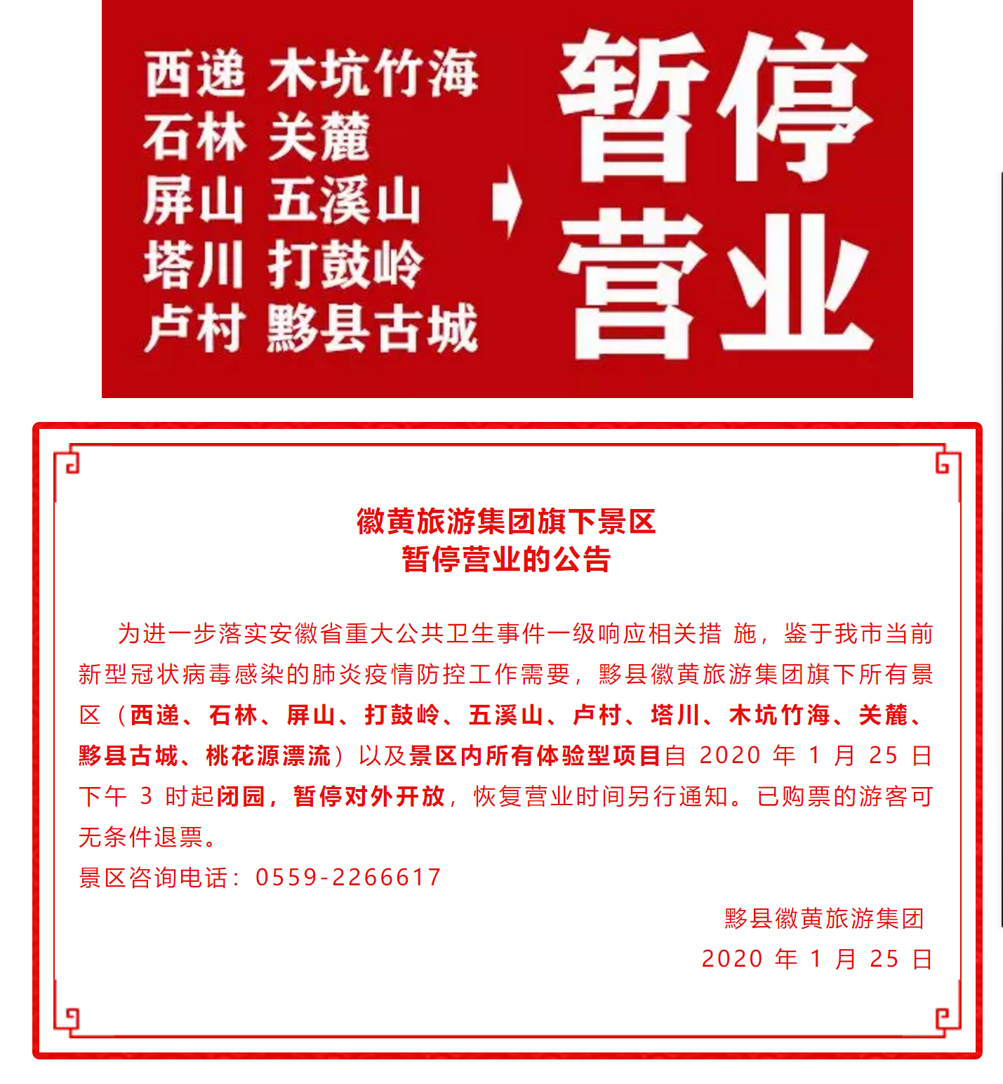 每年春節期間都有大量的海內外遊客到安徽黟縣旅遊。今年疫情發生後,大批遊客行程取消。黟縣文化旅遊體育局第一時間打響疫情防控保衛戰,於1月25日發佈公告:2020年1月25日下午3時起,黟縣境內所有景區暫停對外開放,恢復營業時間另行通知。已購票的遊客可無條件退票。
