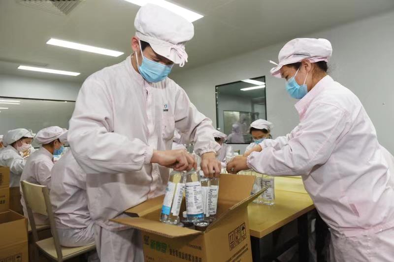 石家莊四藥消毒劑生產線包裝工序員工保質保量加緊生產(石四藥供圖)