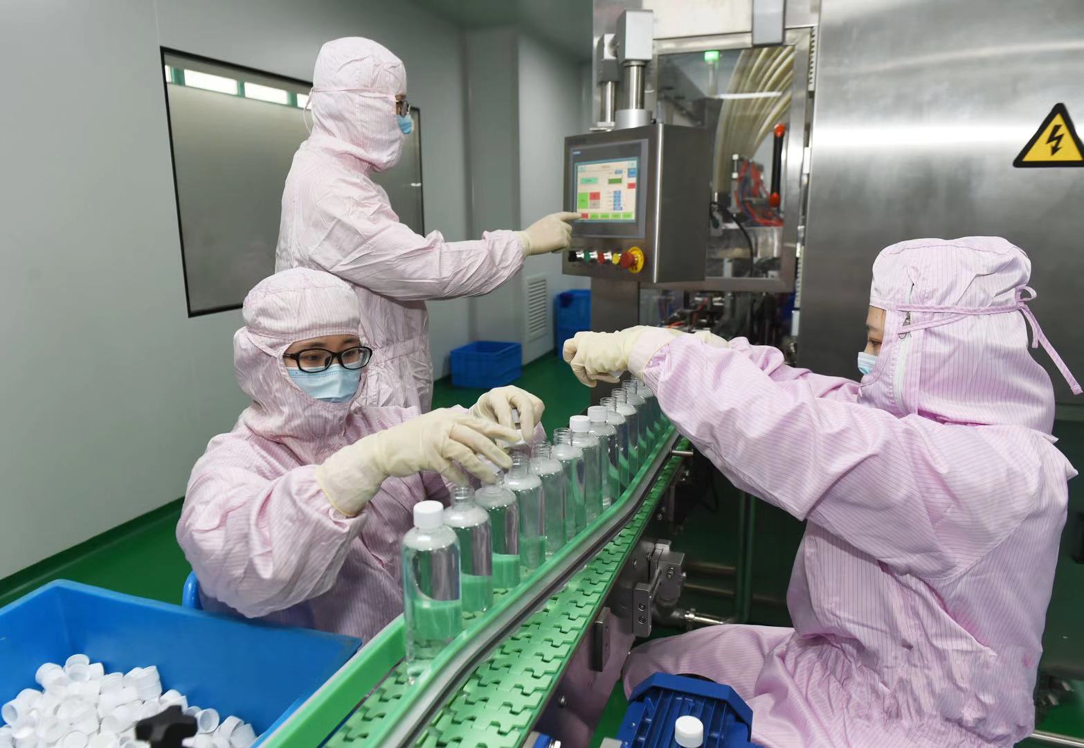 石家莊四藥消毒劑生產線灌裝工序員工全力以赴加緊生產 ,保障供應(石四藥供圖)