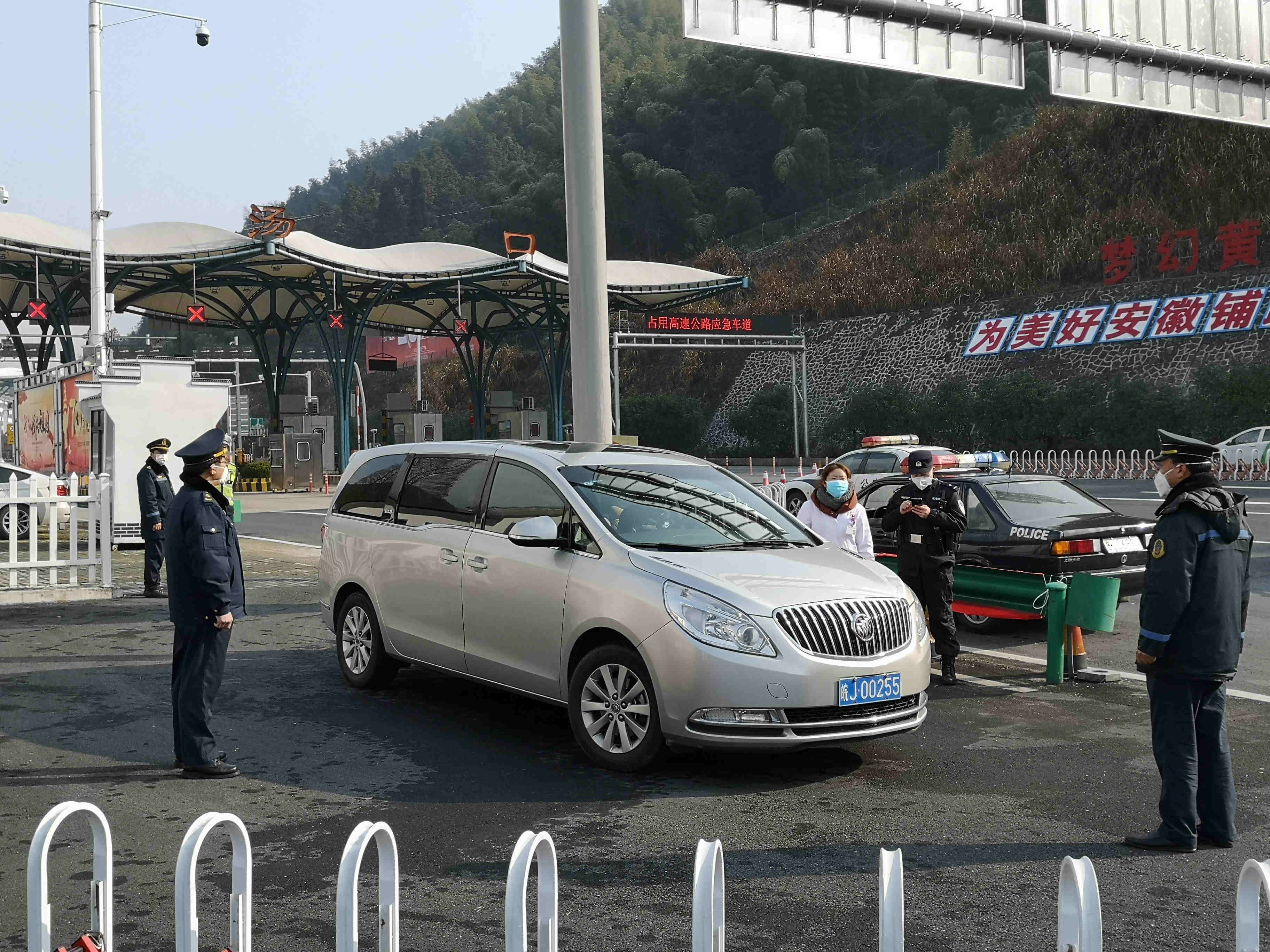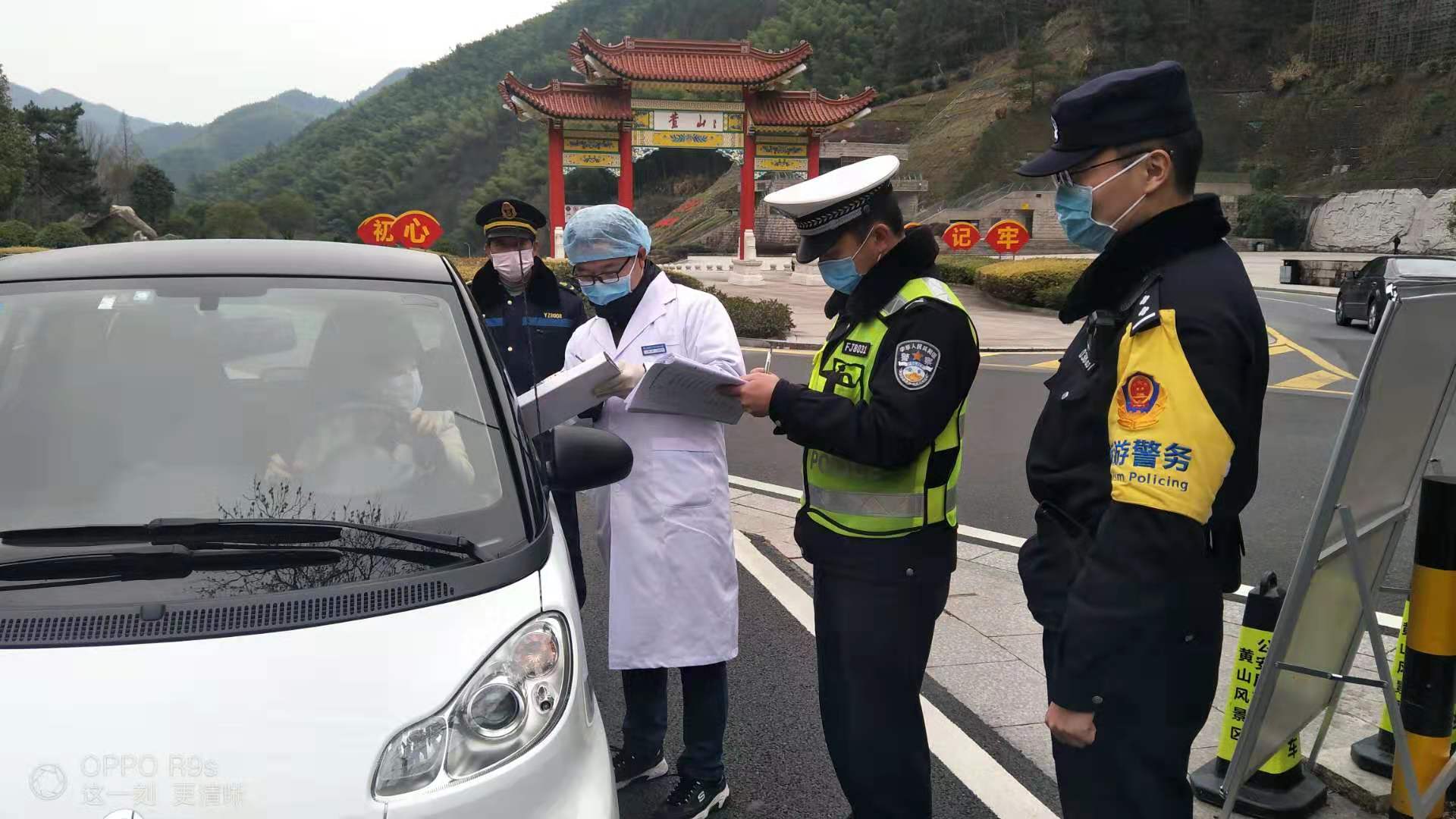 在黃山南大門和北大門卡點派員執勤,協助景區衛生防疫人員做好進山人員體溫檢測,同時加強景區旅遊公路巡查。