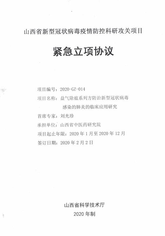 2月2日,山西省科技廳傳來消息,山西省新型冠狀病毒疫情防控科研攻關項目緊急立項,山西省中醫院承擔的“益氣除瘟系列方防治新型冠狀病毒感染的肺炎的臨床應用研究”課題入選。