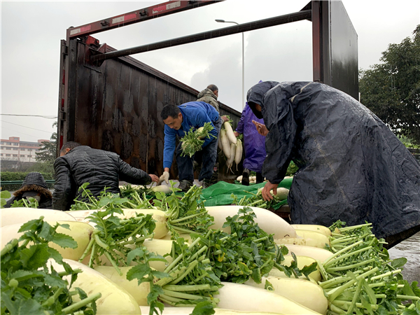 從雙誼鄉出來,運輸車又到菜壩鎮裝載石馬村早已備下的兩萬斤優質蘿蔔,天下着大雨,前來幫忙的村民們顧不得雨勢,抹一抹臉上的雨水和汗水又接着干,「看這蘿蔔多好,又大又甜,送給湖北人民最好。」鄉親們質樸的話全是給湖北加油鼓勁。