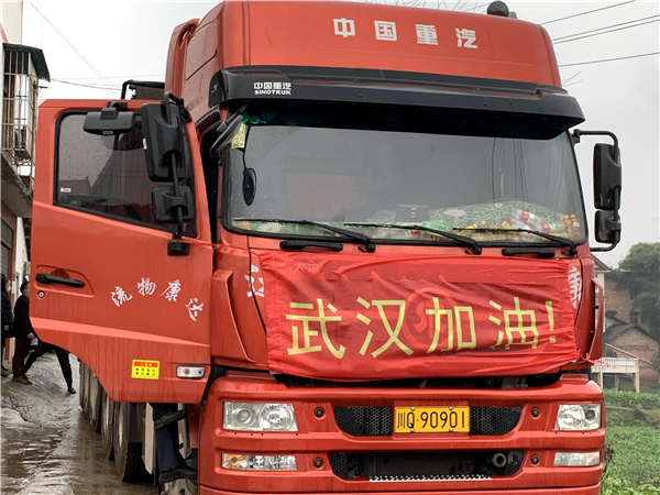 貼着「武漢加油」的兩輛運輸車滿載宜賓人民的情誼向湖北駛去【葉茜 攝】