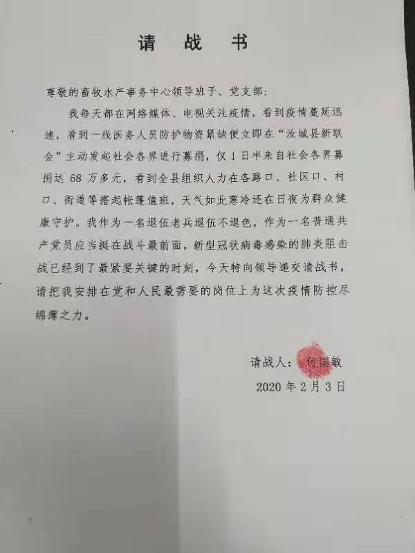 【香港商報網訊】「現在是關鍵時刻,請把我安排到黨和人民最需要的崗位上,為防疫盡綿薄之力」,2月3日,湖南郴州市汝城縣退役軍人事務局辦公室工作人員忙碌之際,又收到一份簽名為「何國敏」的退役軍人請戰書。「我願意每天到防疫最艱苦的崗位去戰鬥,不管是去高速守路口,還是到人民醫院打掃衛生等工作。」退役老兵郭保松在請戰書中說。類似的請戰書,近日該局已收到上百份。