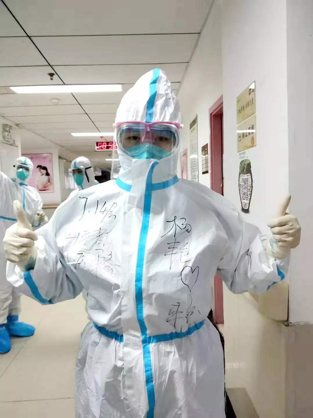 更複雜的是穿著防護服,所有的“大白”都一個樣,傻傻分不清楚。她們就把名字、分管樓層、來自哪裡全都寫在防護服上,以便相互配合,保證工作順利進行!