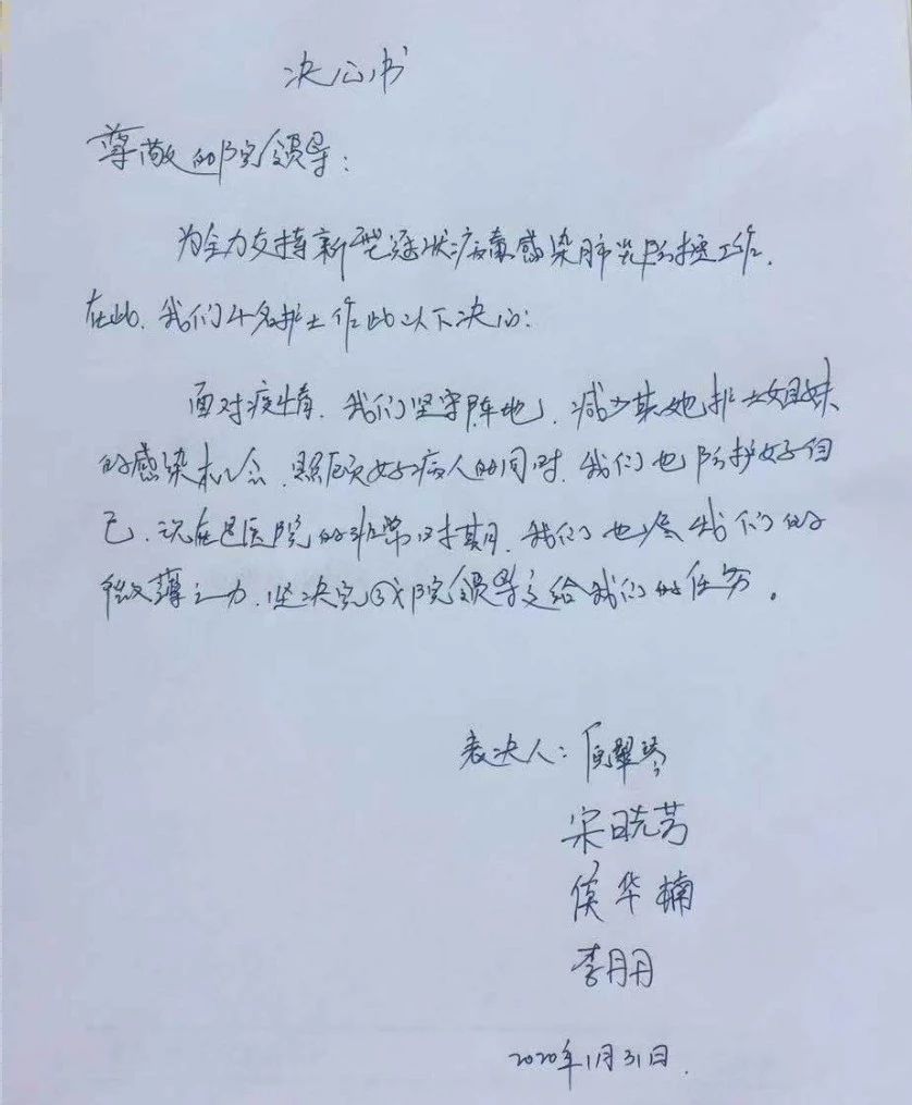 【香港商報網訊】記者 王皓萍 報導:1月31日,河南省淇縣人民醫院護理部收到了一封催淚感人的抗擊疫情請戰書。它來自本就戰鬥在隔離病區最前線的4名護士倪翠琴、宋曉芳、候華楠、李丹丹,為了讓其他護理姐妹減少感染機會,本可以輪換撤出的4位巾幗勇士,主動捨身取義,陣地不撤,決心奮戰到底。