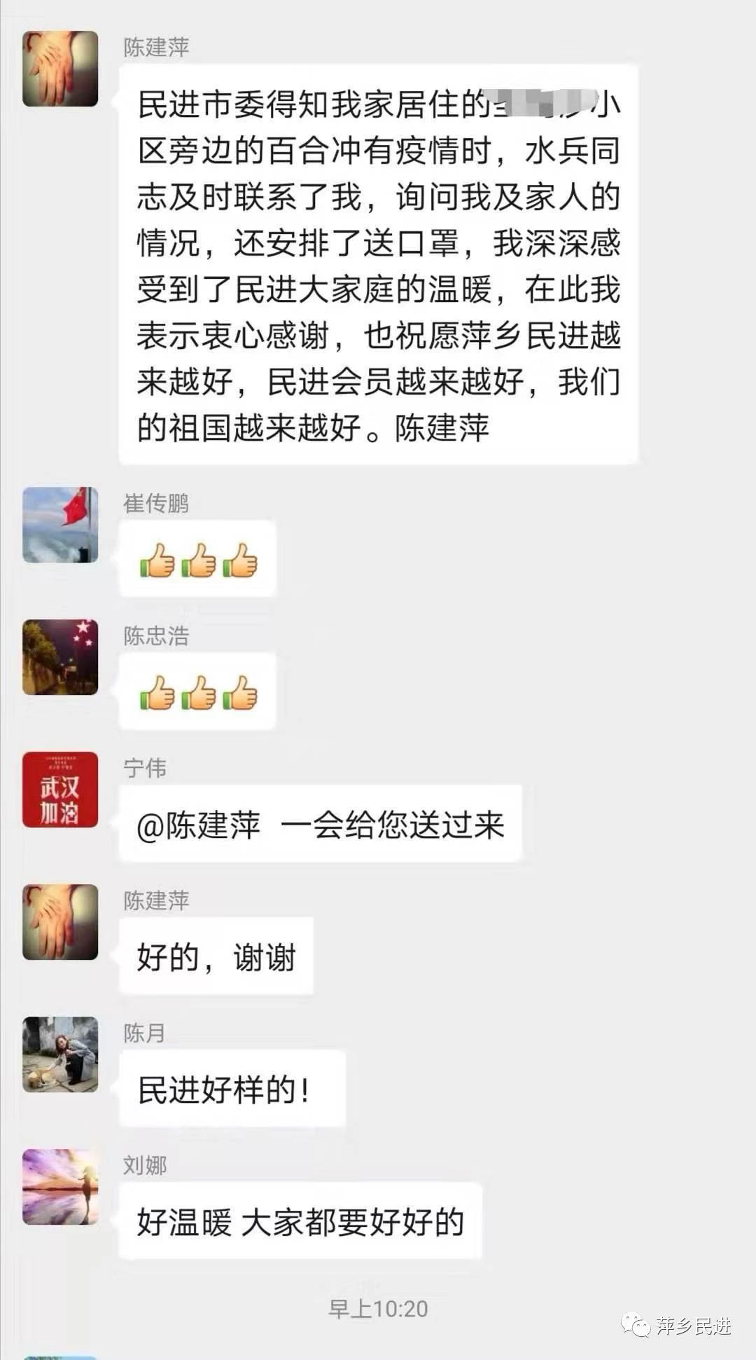 民進萍鄉市工委會組織開展會員防疫情況摸排工作,得知會員陳建萍家小區旁邊的百合沖社區某小區有新型冠疫情,民進市工委會主委崔傳鵬派辦公室主任鍾水兵第一時間聯繫陳建萍,關切詢問陳老及家人情況。了解到陳建萍沒有口罩等防護品的情況,立即協請會員寧偉送去口罩。「我深深感受到了民進大家庭的溫暖,在此我表示衷心感謝,也祝願萍鄉民進越來越好,民進會員越來越好,我們的祖國越來越好。」陳建萍老師在萍鄉民進群中深情祝福,體現了民進組織的溫暖和民進會員團結一心、共同抗疫的決心。