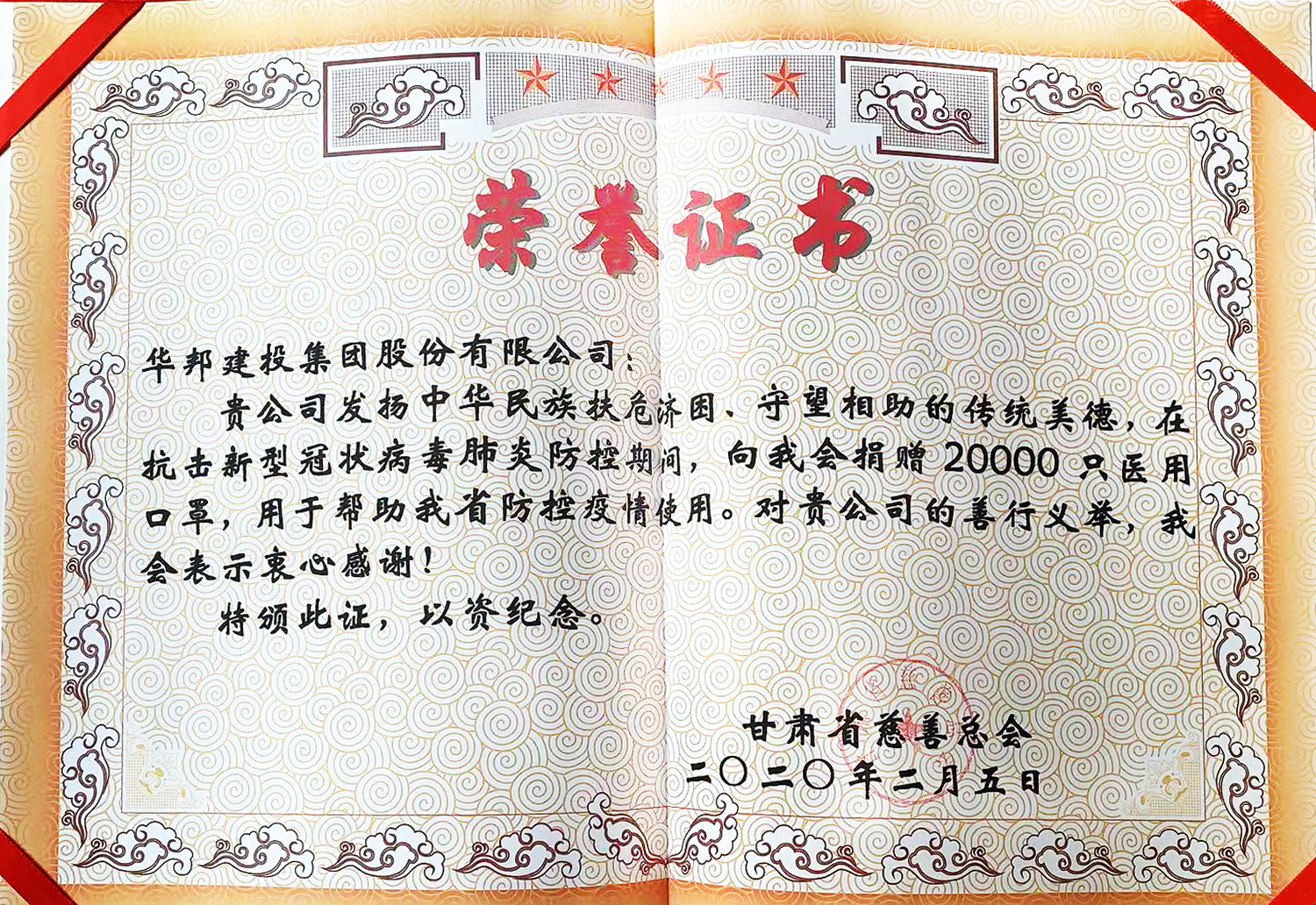 生於斯,長於斯。華邦控股集團起步於隴原大地,並從甘肅走向全國。飲水思源,在得知甘肅疫情防控物資緊張的情況後,華邦控股集團快速響應,主動聯繫甘肅省慈善總會,並全力籌集一批醫用口罩以支持疫情防控工作,同舟共濟共克時艱。相信在黨和政府的堅強領導下,一定能打贏新型冠狀病毒疫情防控阻擊戰,取得抗擊疫情決定性勝利。