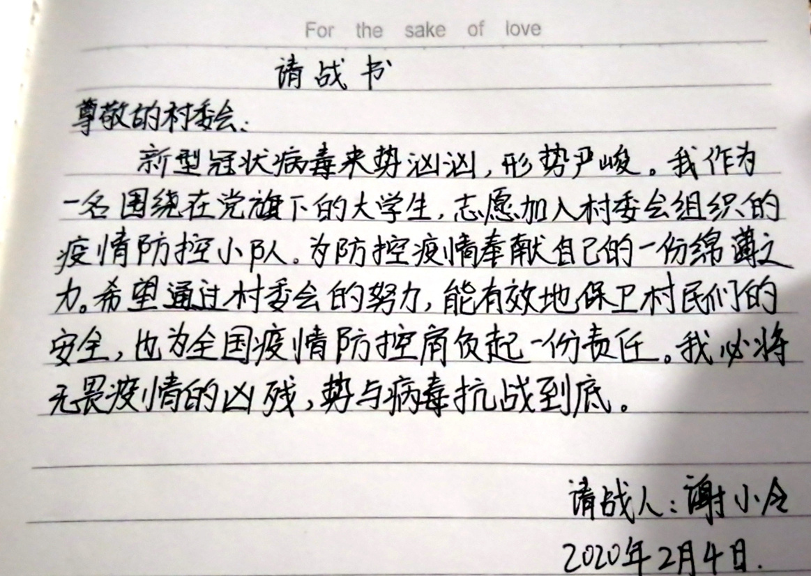 「我的父母都是普通的農民,疫情發生後我們就一直在家裡哪兒都沒去,雖然下定了這個決心,但得到家人的支持並不容易。但我們也希望在這場疫情中貢獻一份力量,看到趙書記在群里號召,我們都不約而同地寫下了「請戰書」大學生宋海波說。