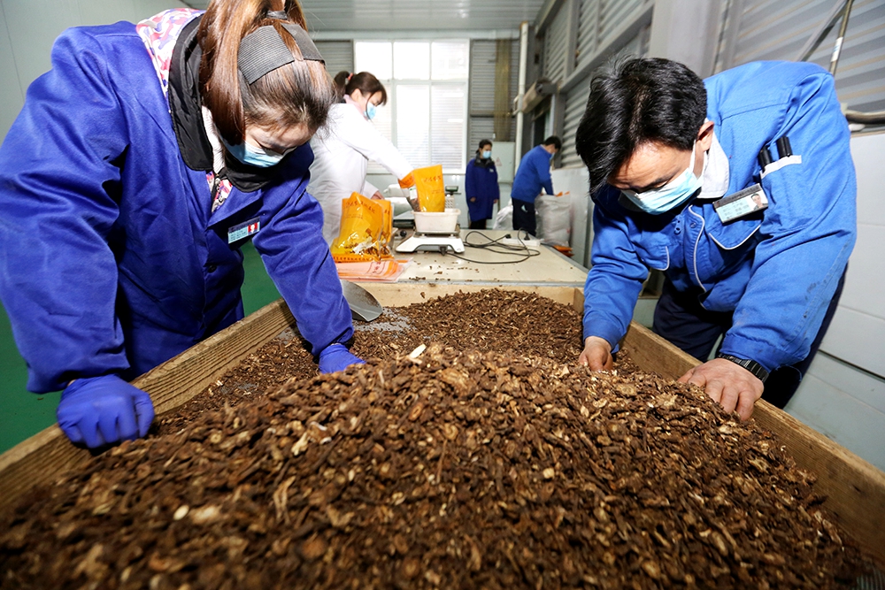 公司的原料庫堆滿了從各地調來的藥材,按照全草類、花類、果實種子類、根及根莖類、葉類分門別類地整齊擺放着,讓人一目了然。