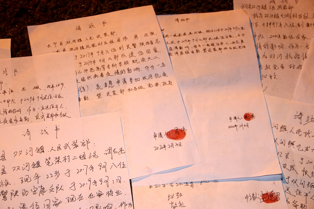 【香港商報網訊】「報告老班長,退役軍人前來報道!」2月4日,11名退役老兵帶着「請戰書」來到四川省宜賓市長寧縣雙河鎮退役軍人事務中心,主動請戰參與防控工作。在報經鎮防疫指揮部同意後,這些退役軍人迅速成為了雙河疫情防控工作隊一員。
