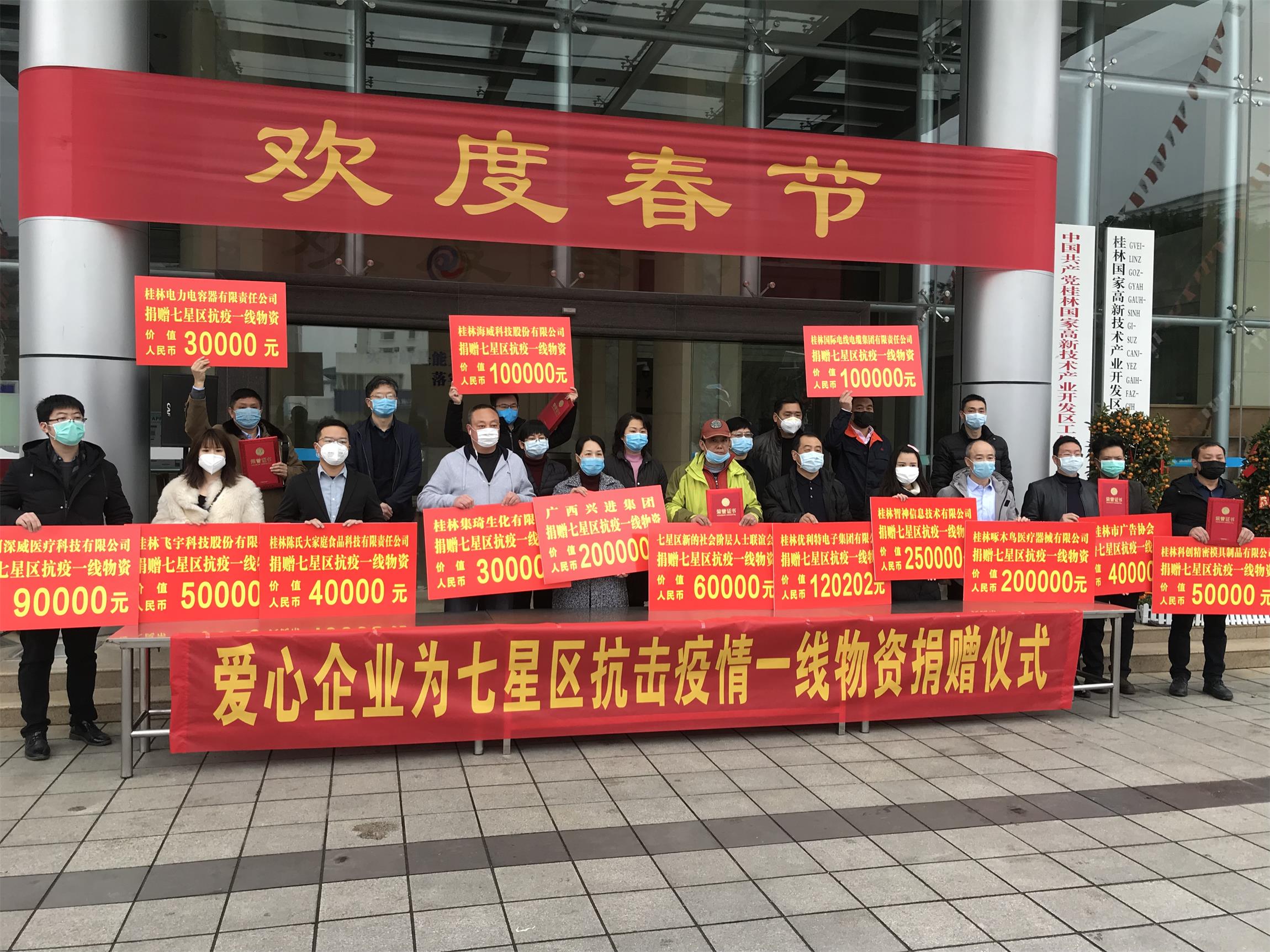 【香港商報網訊】目前正處於新型冠狀病毒感染的肺炎疫情防控關鍵時期,廣西桂林高新七星區民營企業勇挑社會責任,發揮各自優勢、整合各類資源,紛紛捐款捐物支持基層一線疫情防控工作。2月5日,高新七星區舉行愛心企業為轄區抗擊疫情一線物資捐贈儀式,13家愛心企業共捐贈愛心款和物資總額超過100萬元。