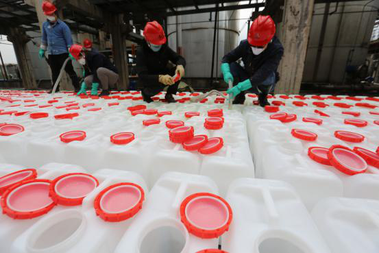 陳洪說:「現在處於特殊時期,作為國企,有更大的社會責任,所以我們不計成本,生產出的25公斤桶裝消毒液以每桶40元的價格供給有關部門統一調配。」