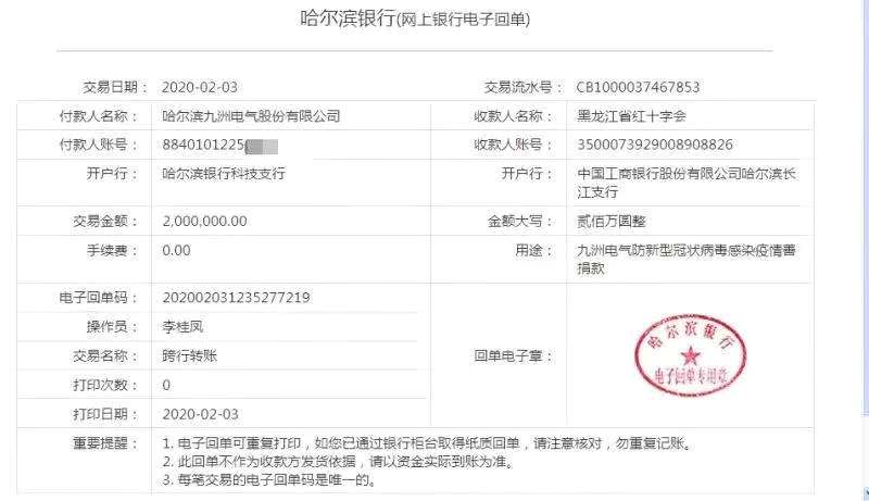 「疫」情當前,大愛彰顯。一張無言的匯款交易流水憑證(網上銀行電子回單),就是一份流淌的、沉甸甸的家國情懷、良知企業拳拳愛國之心。記者見到,當日,哈爾濱九洲電氣股份有限公司通過某銀行成功向黑龍江省紅十字會捐贈資金200萬元,用途一欄註明:九洲電氣防新型冠狀病毒感染疫情善捐款,敬意之情油然而生。