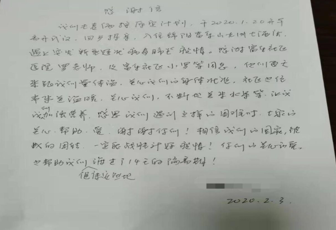 【香港商報網訊】日前,四川省綿陽市遊仙區富樂街道收到來自武漢滯留綿陽的李飛(化名)夫婦一封信。「感謝在我們遇到困難時,大家的關心和關愛。謝謝你們幫助我們夫妻健康安然度過了14天的隔離期!」