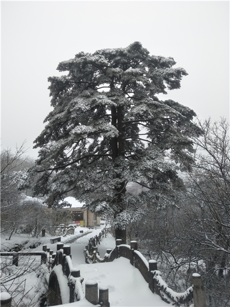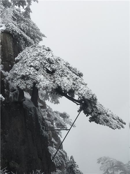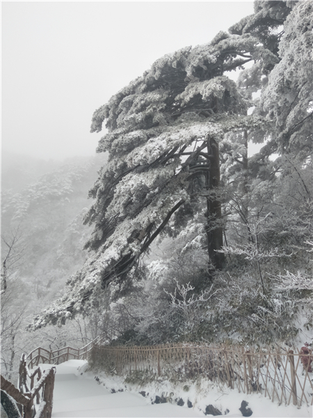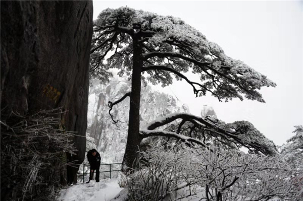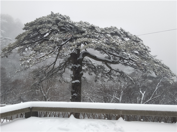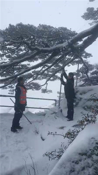 強降雪天氣給迎客松等古樹名木保護管理工作帶來了壓力,管委會園林局玉屏管理區迅速召集在崗的古樹名木應急保護小分隊成員,及時調試保養應急發電、照明等設備,並用毛竹製作臨時支撐杆20餘根,對青獅石下方及周邊鋪墊麻袋13條,加強值班尤其是夜間值守工作,每小時測量記錄地面、樹體、松針積雪厚度和風力、溫度等相關數據,做好迎客松24小時守護,確保了迎客松等古樹名木安全。(吳敏 吳俊 胡徽暉 葛旭芳)