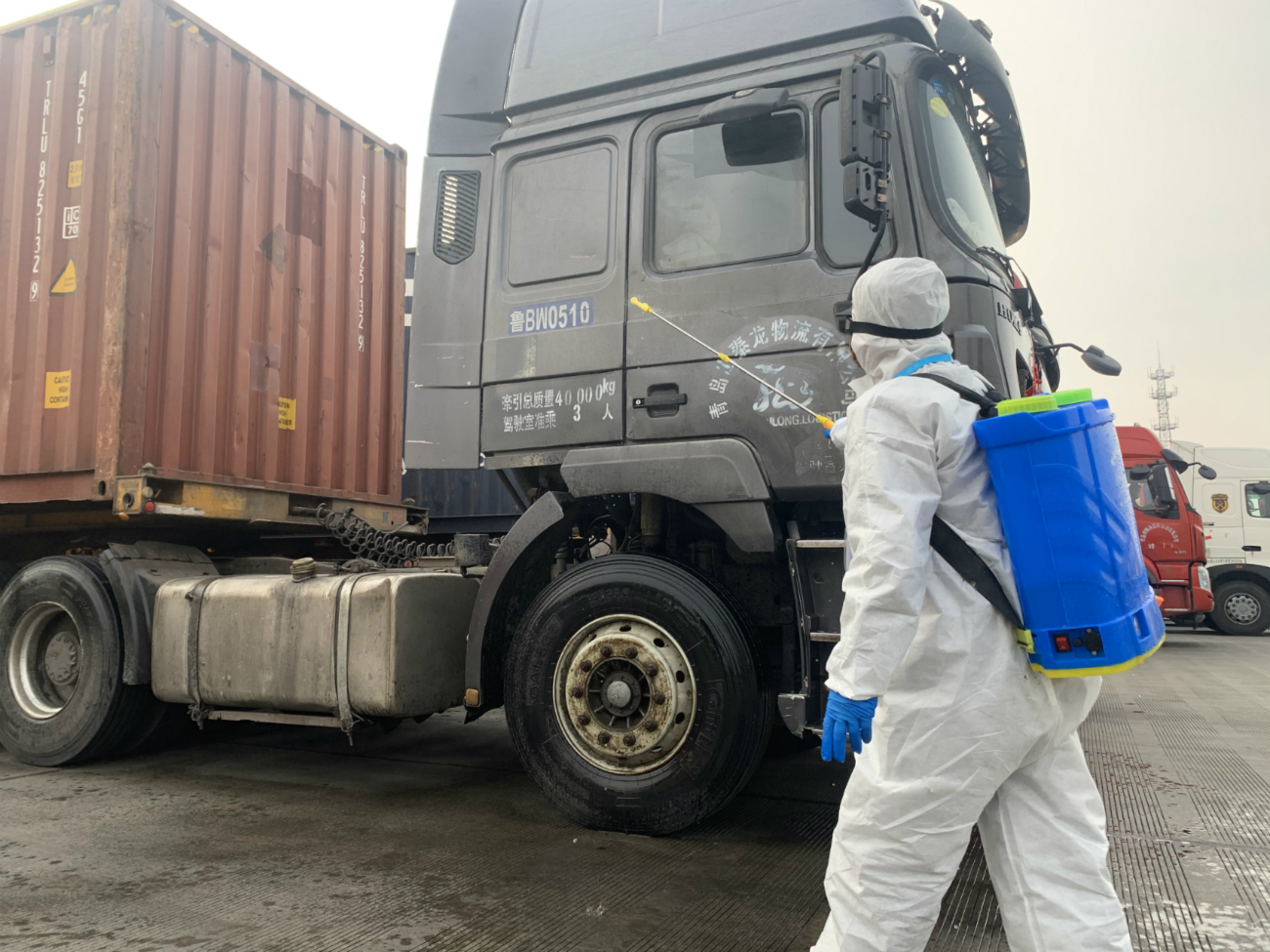 西安國際港務區嚴抓疫情防控,物流車輛進入園區要進行三次消殺