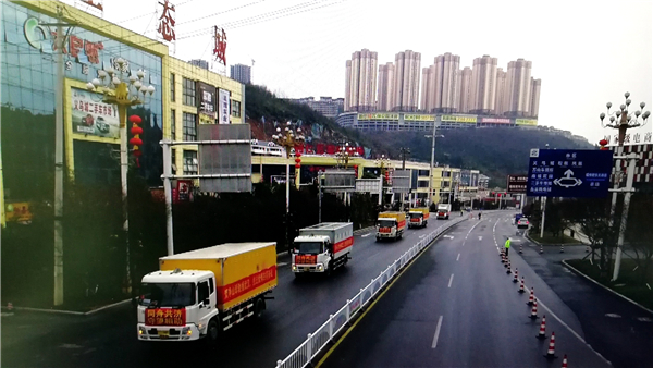 當日上午9時33分,裝滿抗擊疫情物資的車輛緩緩駛出銅仁高速南站,駛向湖北省武漢市。