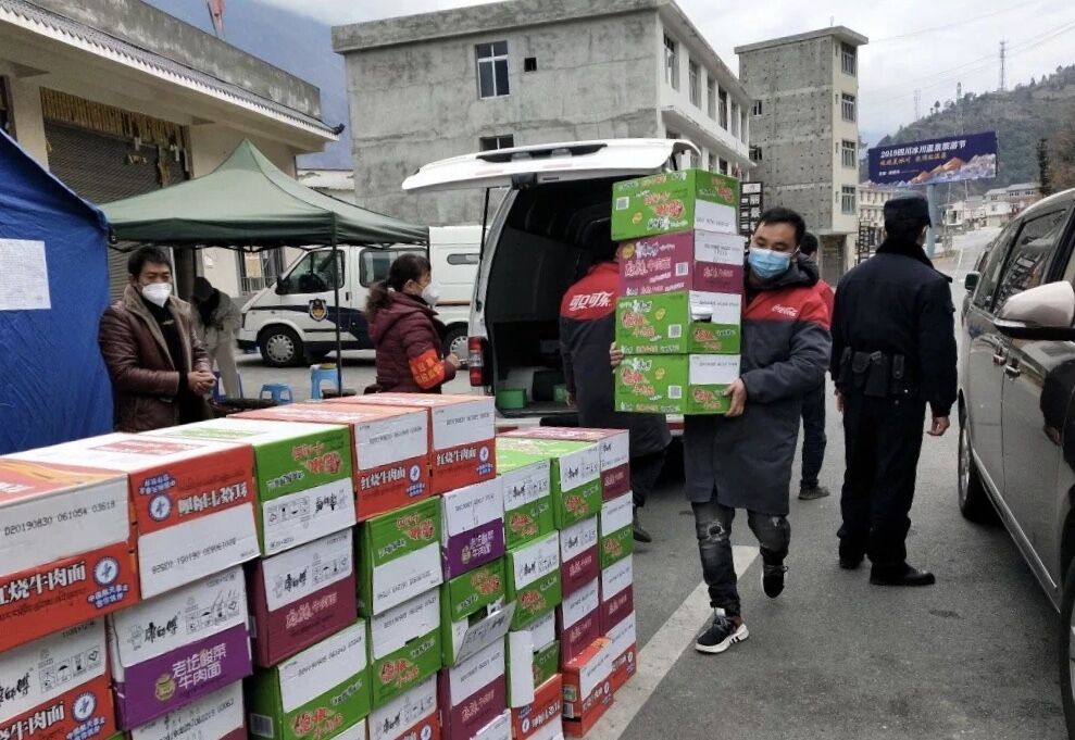 2月7日上午,海螺溝景區鄰家超市、老兵超市等個體商戶開着一輛輛滿載即食麵、礦泉水、牛奶等物資的車,駛向海螺溝檢疫卡點,為一線執勤值崗的防疫工作人員送來了寒冬中的「溫暖」物資。領家超市店家趙剛說,他們在前面為我們保駕護航,我們送點東西,讓他們晚上有點吃的,這些都是應該的。