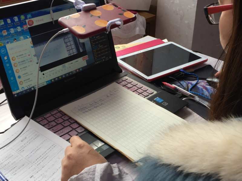 在平武中學高三數學教師趙香榮的家中,一張小書桌、一台筆記本電腦、一台平板電腦、一部手機、一本教材、兩個作業本,構成了她網絡直播課堂的全部要素。2月8日下午,她正在同事的協助下,開展網絡直播課程的最後調試準備工作。