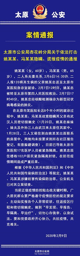 【香港商報網訊】據央視新聞記者報導:2月9日,山西省太原市公安局對外通報一起因隱瞞、謊報疫情被警方立案偵查案件。