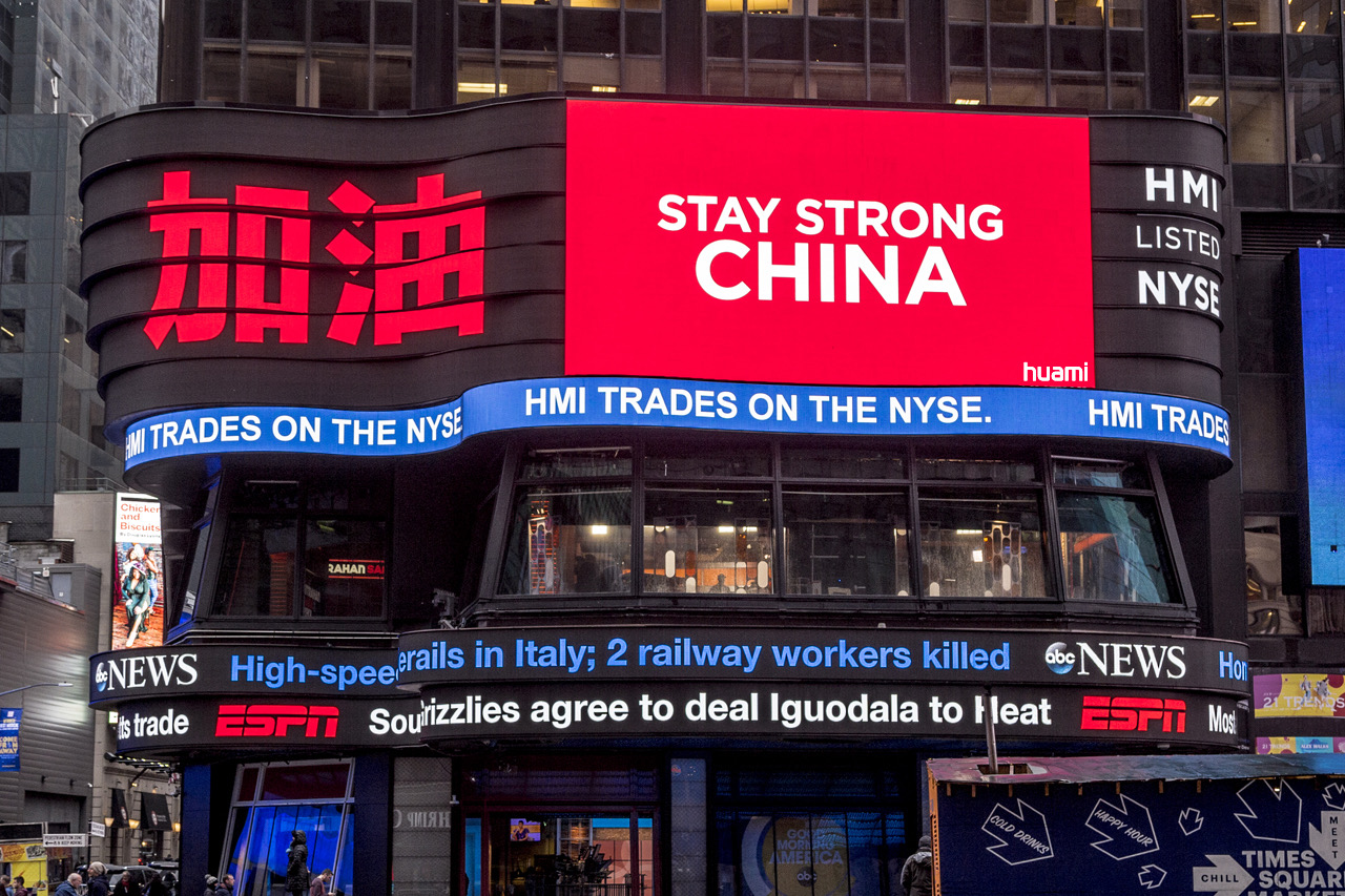2020年2月8日華米科技在紐約時代廣場為中國點贊的畫面