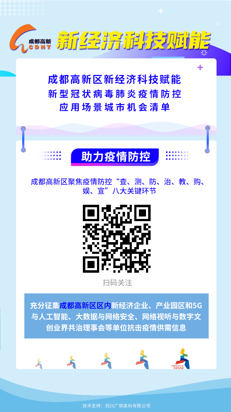 據悉,除了涵蓋首批清單「查、測、防、治」環節外,第二批次機會清單更加聚焦「教、購、娛、宣」四大關鍵環節,主動回應民生關切,適應疫情防控需要,重點圍繞互聯網醫療、在線教育等新業態,共發佈由成都高新區內139家企業提供的228種產品和服務,將充分利用現代化科技手段,有效減少人員聚集流動,降低病毒傳播風險。