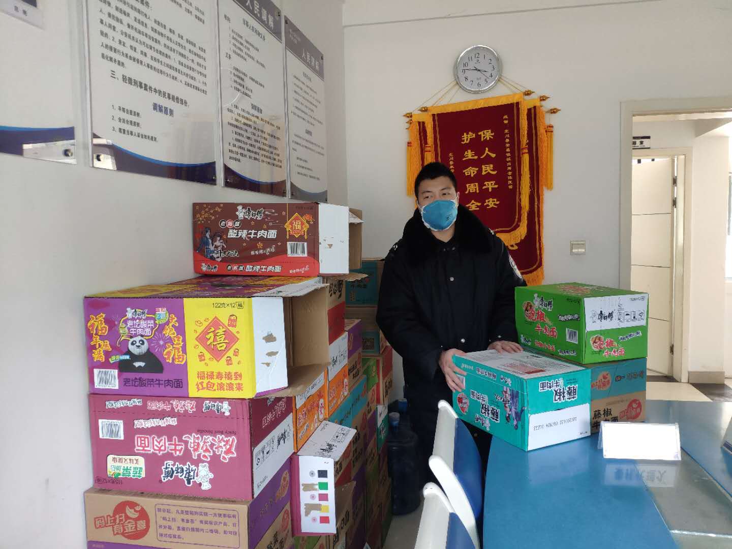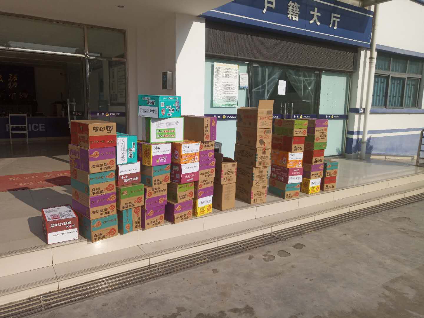 【香港商報網訊】9日上午,一輛白色轎車開進安昌派出所,駕駛員下車打開後備箱就一箱一箱的朝下搬物質,即食麵、麵包、餅乾堆成了小山。他只給民警說:「你們太辛苦了!不要問我是誰,也不要照相,這是一點心意和對你們的敬意!」。搬完東西就開車走了。