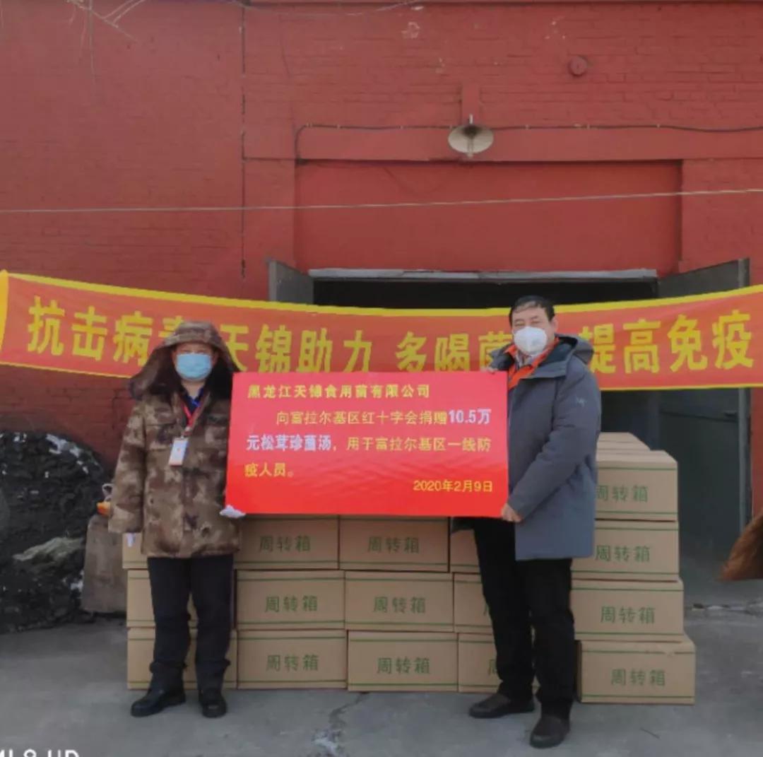 【香港商報網訊】庚子春臨,新冠病毒,突如其來。橫衝荊楚,席捲江漢。舉國防疫,九州閉戶。大疫當前,危難時刻,每一份疫情都牽動着億萬人民的心。一方有難,八方支援,2月10日,黑龍江天錦食用菌有限公司,向所在地齊齊哈爾市富拉爾基區紅十字會捐贈3000袋松茸珍菌湯,價值10.5萬元,用於慰問一線醫護和公安等工作人員,盡己綿薄之力。
