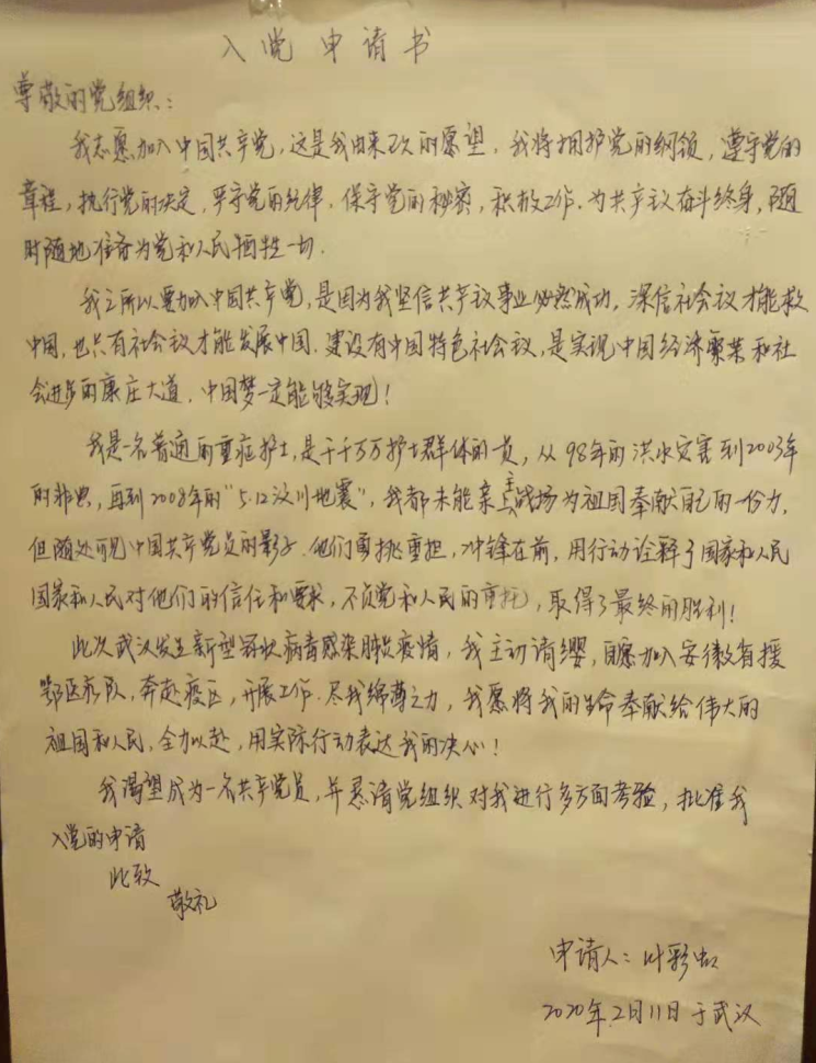 【香港商報網訊】疫情防控中,一名黨員就是一面旗幟。2月11日,第三批安徽省援鄂醫療隊成員之一的黃山區人民醫院護士葉彩虹向安徽黃山市黃山區人民醫院院黨委提交入黨申請書。