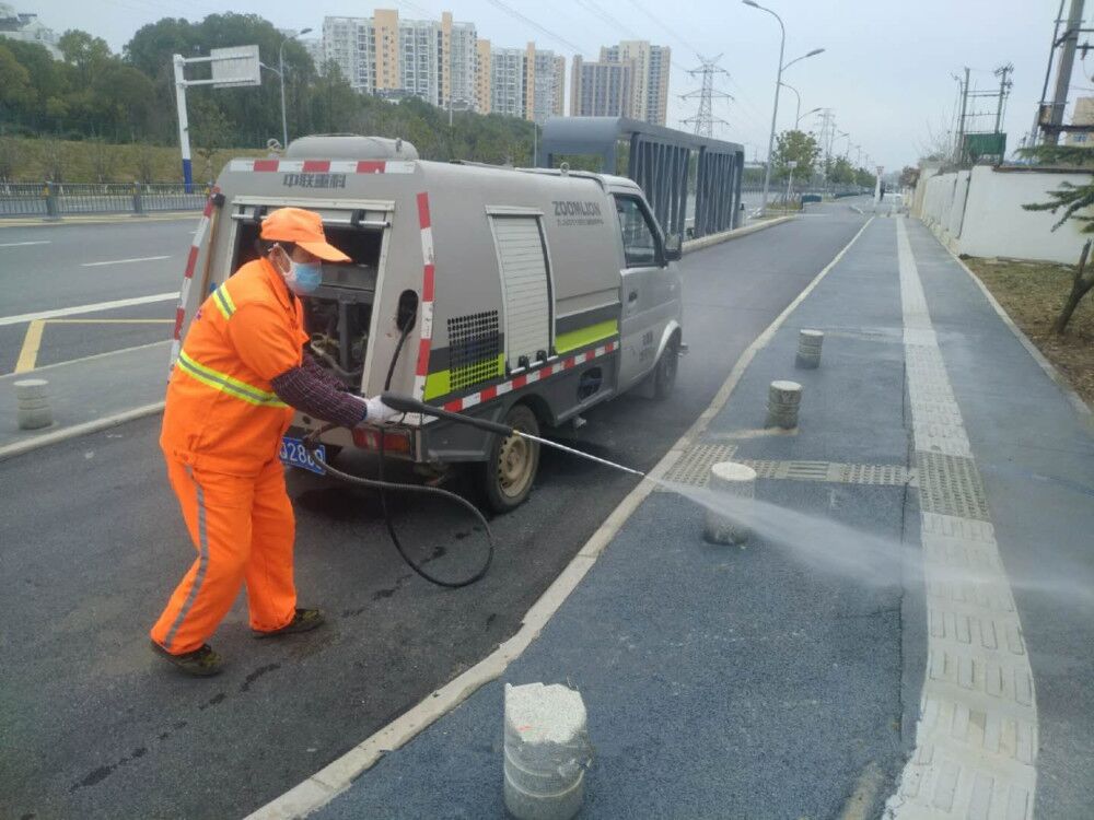 當天上午,在合肥經開區蓬萊路公廁外,一輛小型清洗車停放在路邊。一名佩戴口罩、手套,穿着作業服的環衛工人從車尾拖出一隻水槍,向入廁道路衝去。只見槍頭噴出霧蒙蒙的液體,伴隨着着一股消毒水的味道。