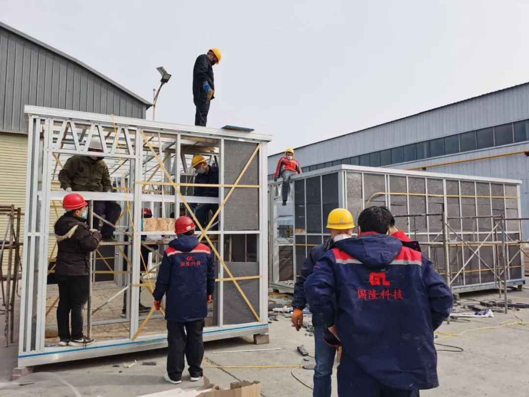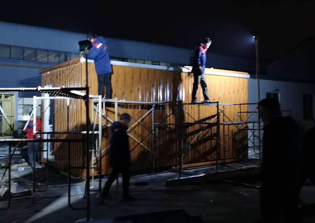 據了解,國隆科技科技裝配式建築生產基地投入了13條生產線,生產一線的突擊隊隊員們加班加點趕製房屋,組裝數以萬計精工件。公司工程部的突擊隊員們有一半兒都是吃住在單位,基本上是每天晚上都要加班到凌晨的,然後第二天再接着上工,行政部門的突擊隊員們每天到現場之後也是幫忙裁板子,裝板子。下雪了,冒着寒凍依然如故在室外分工裝房,好多員工手腳都凍腫了。