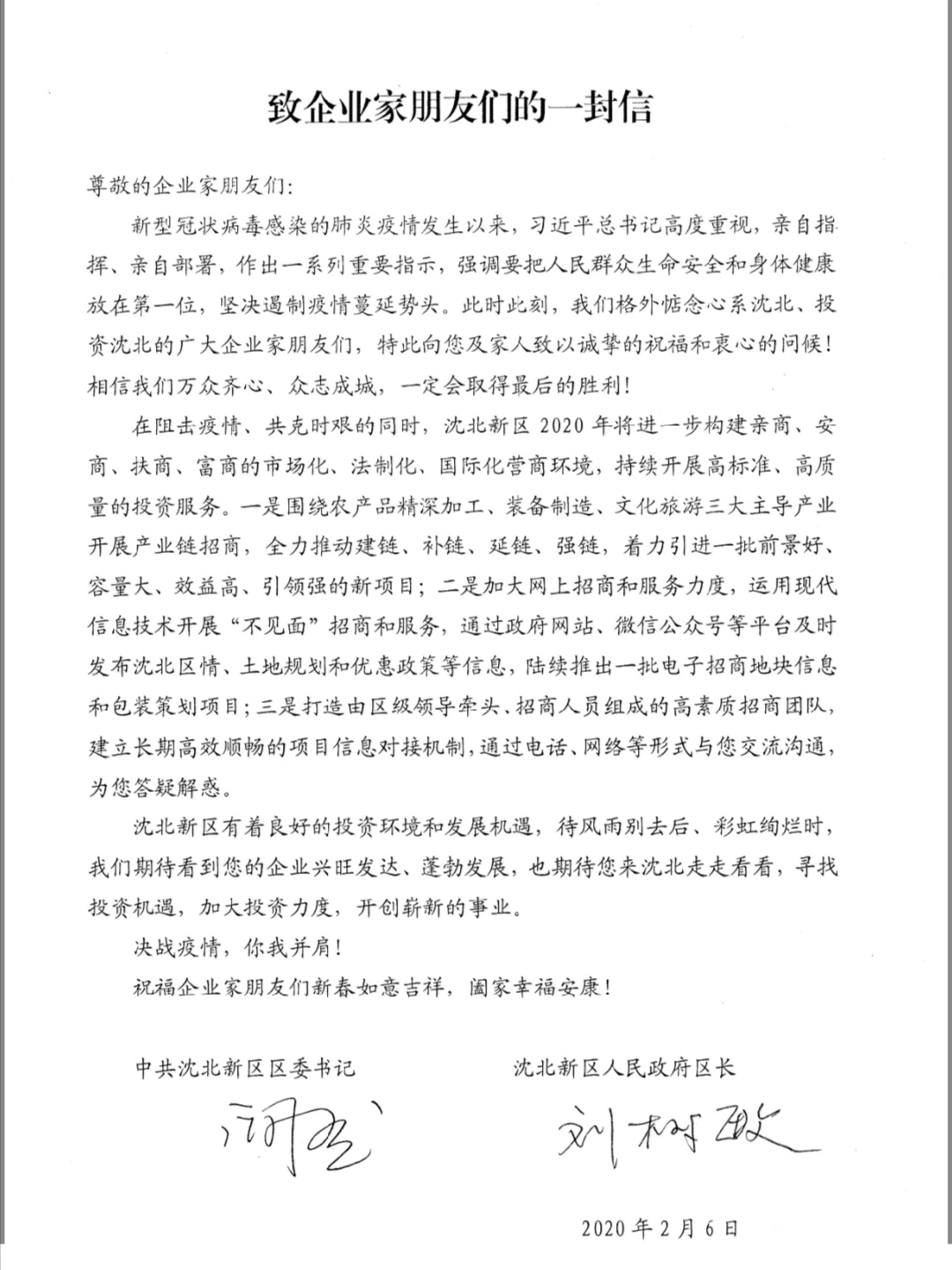 【香港商报網訊】記者從沈北新區了解到,日前,沈北新區區委書記聞然、區長劉樹敏給在沈北新區的企業家寫了一封公開信。信中不僅表達了願與在區企業風雨同舟,打贏這場疫情防控阻擊戰的決心,更表達了沈北新區願竭誠為企業解憂、為企業助力、為企業賦能的責任擔當。同時信中列出了系列重点招商項目、招商方式、招商愿景等。