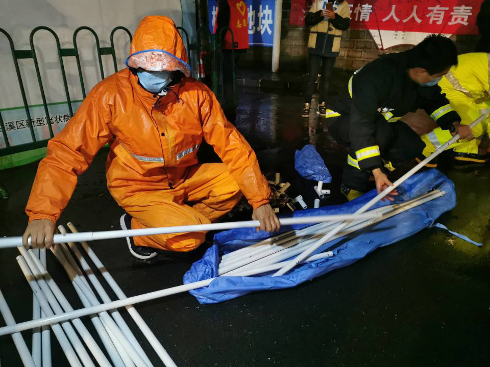 消防隊員們冒雨為夜間值班人員搭建帳篷