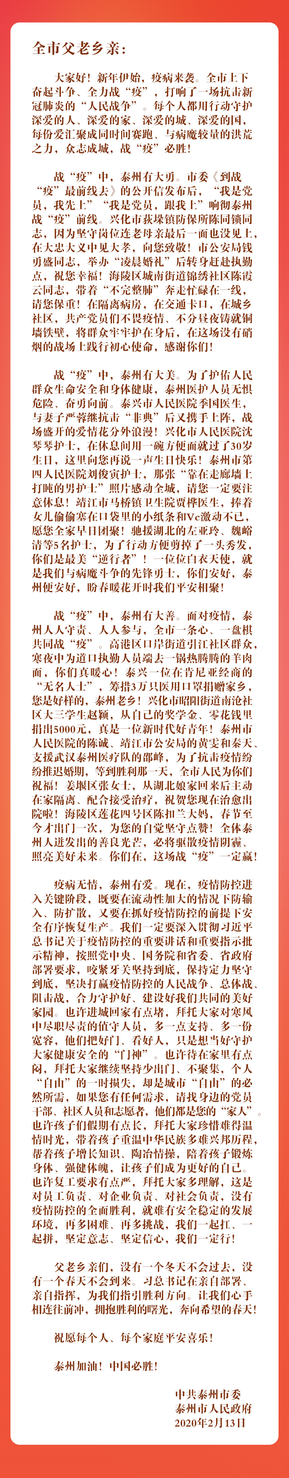 2月13日泰州市委、泰州市人民政府向該市人民發佈了抗擊疫情的公開信