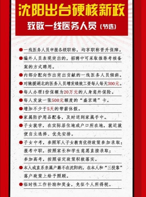 【香港商報網訊】2月13日,記者從瀋陽市政府了解到,《瀋陽市保障防控新冠肺炎疫情一線醫務人員及其家屬的若干措施》(以下簡稱「措施」)出台,圍繞做好一線醫務人員及其家屬的關心關愛和服務保障工作,提出生活、心理、人文、安全、職稱晉陞、子女教育等10方面28項保障措施。
