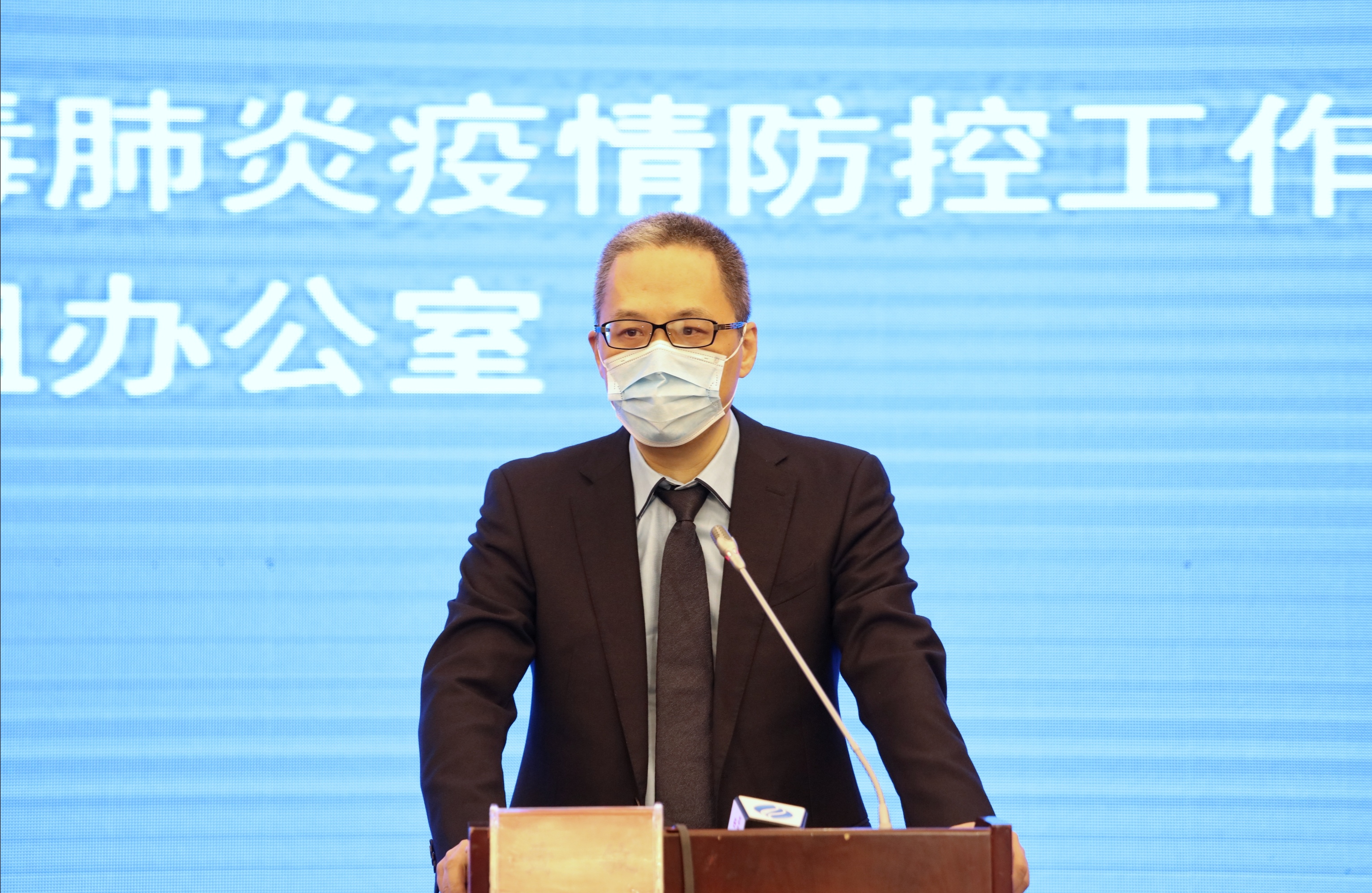 關於新冠肺炎防控工作新聞發佈會現場,安徽省委宣傳部新聞發佈處處長武瀟主持發佈會(左),中國人民銀行合肥中心支行副行長黃敏介紹相關情況並答記者問(劉煒鑫/攝)