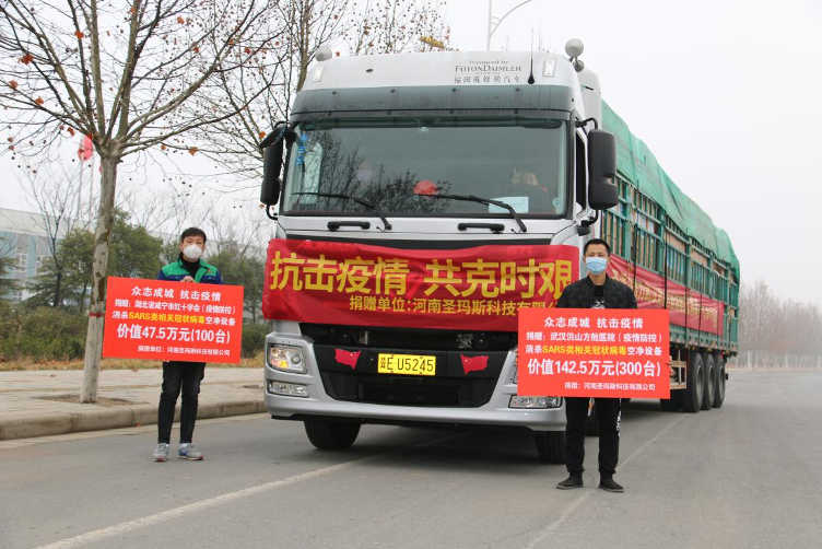 據介紹,為支援疫情防控工作,在市場斷貨情勢下,聖瑪斯濾材生產基地和凈化器生產基地及物流等各部門晝夜加班,優先安排產能,已於2月10日將100台聖派爾消殺SARS類相關冠狀病毒空氣凈化器運輸到鄭州岐伯山醫院(鄭州市第一人民醫院傳染病醫院)。2月13日10點將疫情捐贈物資分別發出:武漢市武昌區方艙醫院、咸寧市紅十字會、三門峽人民政府、漯河市慈善總會、新鄉市疫情防控指揮中心、原陽縣產業疫情防控指揮部。