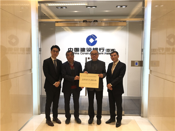 捐款發起人山西省政協常委及港區召集人蔡志忠(右二)、港區資深政協委員張宏業(左二)匯出愛晉人士捐款51.5萬港幣