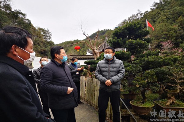 2月15日,歙縣縣長吳旭光(左2)到雄村鎮賣花漁村調研指導盆景產業發展情況