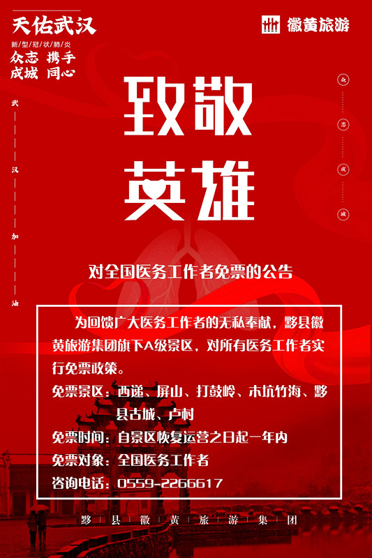 致敬醫者仁心、褒揚人間大愛。黟縣徽黃旅遊集團副總經理盛支君表示,為堅決打贏新冠肺炎疫情防控阻擊戰,全國醫務工作者迎難而上、服從命令、奮戰在防控第一線,守護廣大群眾的生命安全和身體健康,他們是“時代的英雄”,“最美逆行者”。黟縣徽黃旅遊集團決定以實際行動,回饋廣大醫務工作者的無私奉獻,決定集團旗下所有A級景區對全國醫務人員實行免票政策(此活動不含景區內的二消项目)。