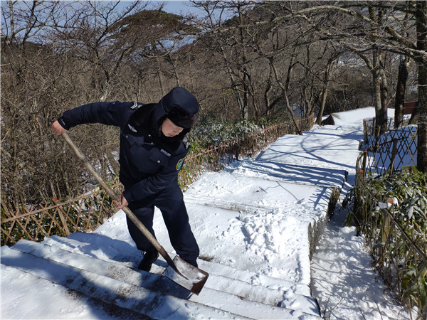 2月15日晚,黃山風景區迎來降雪,16日早,蔣鵬濤在路段上清理積雪