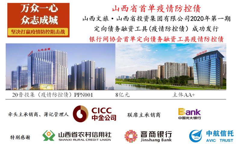 本期債券名稱為:山西省投資集團有限公司2020年度第一期非公開定向債務融資工具(疫情防控債);簡稱代碼:20晉投集(疫情防控債)PPN001;牽頭主承銷商、簿記管理人:中金證券;聯席主承銷商:光大銀行。