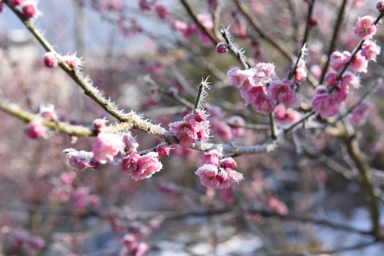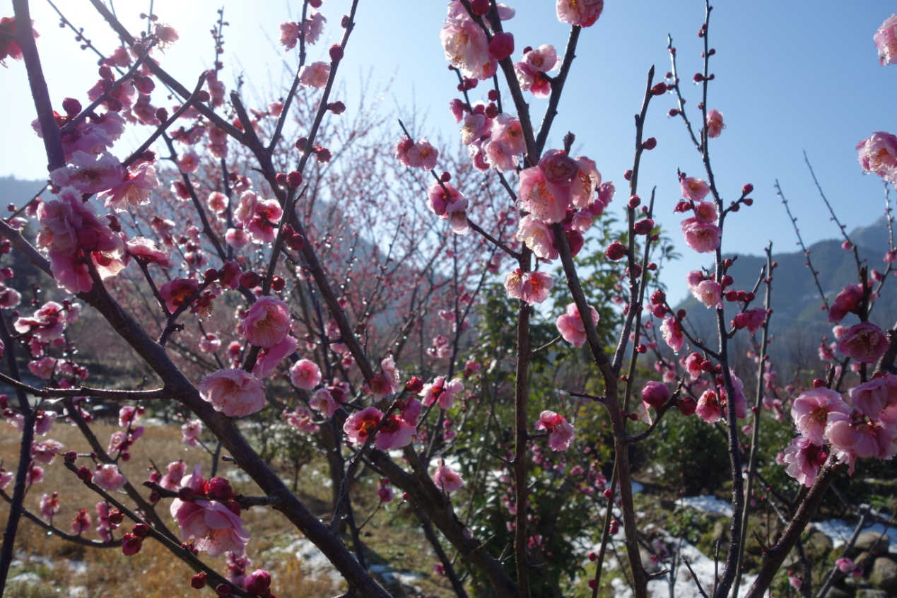 各色品種的梅花在雪後初晴的藍天掩映之下競相綻放
